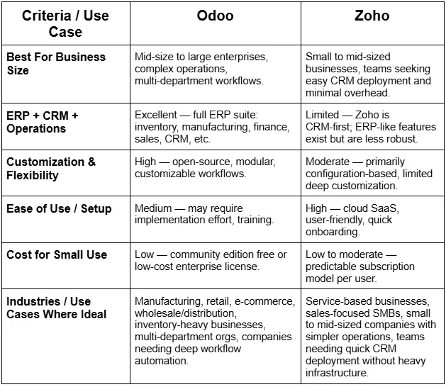 If growth involves adding departments, inventory, manufacturing, or diversifying operations, Odoo tends to be more cost-effective long-term due to modular pricing and flexibility.If you only need CRM and sales-focused operations, Zoho may be more cost-effective initially because of predictable subscription costs and minimal overhead.